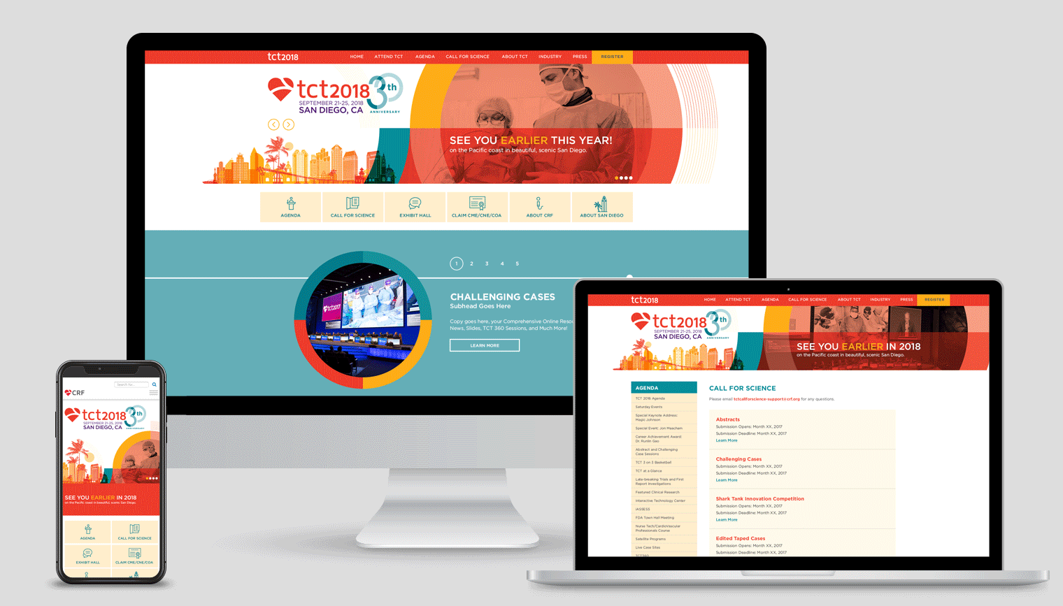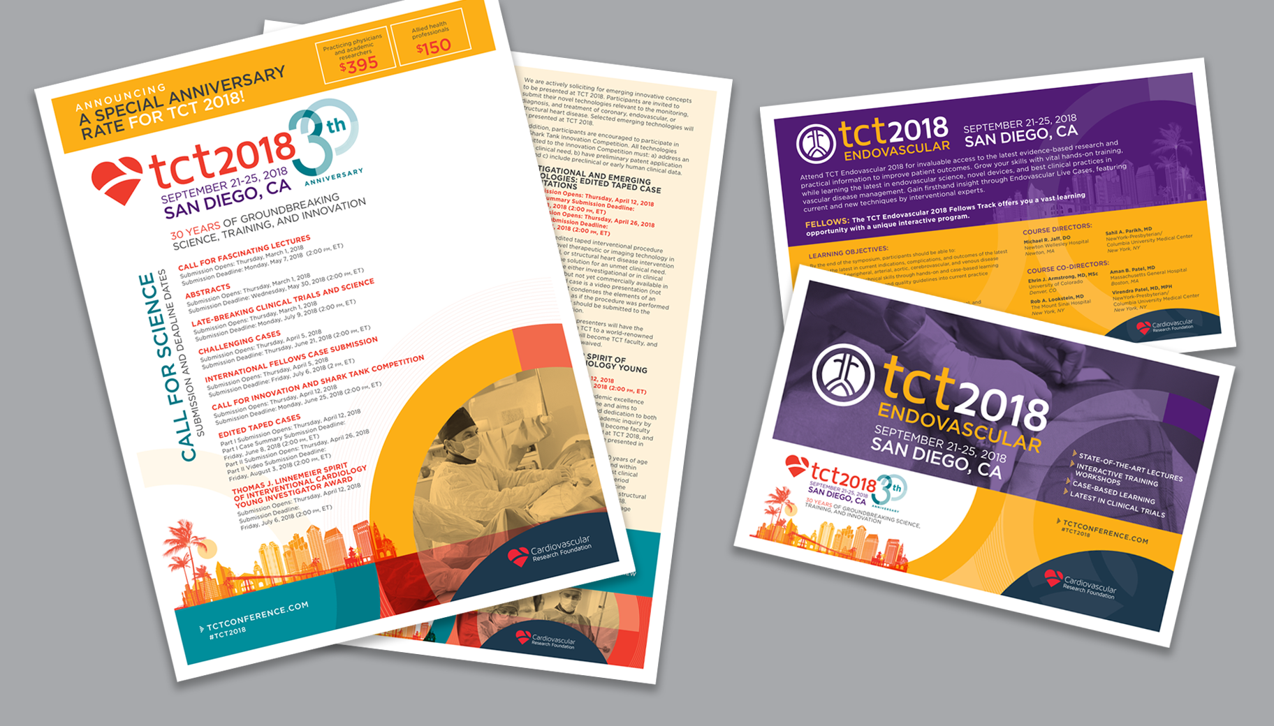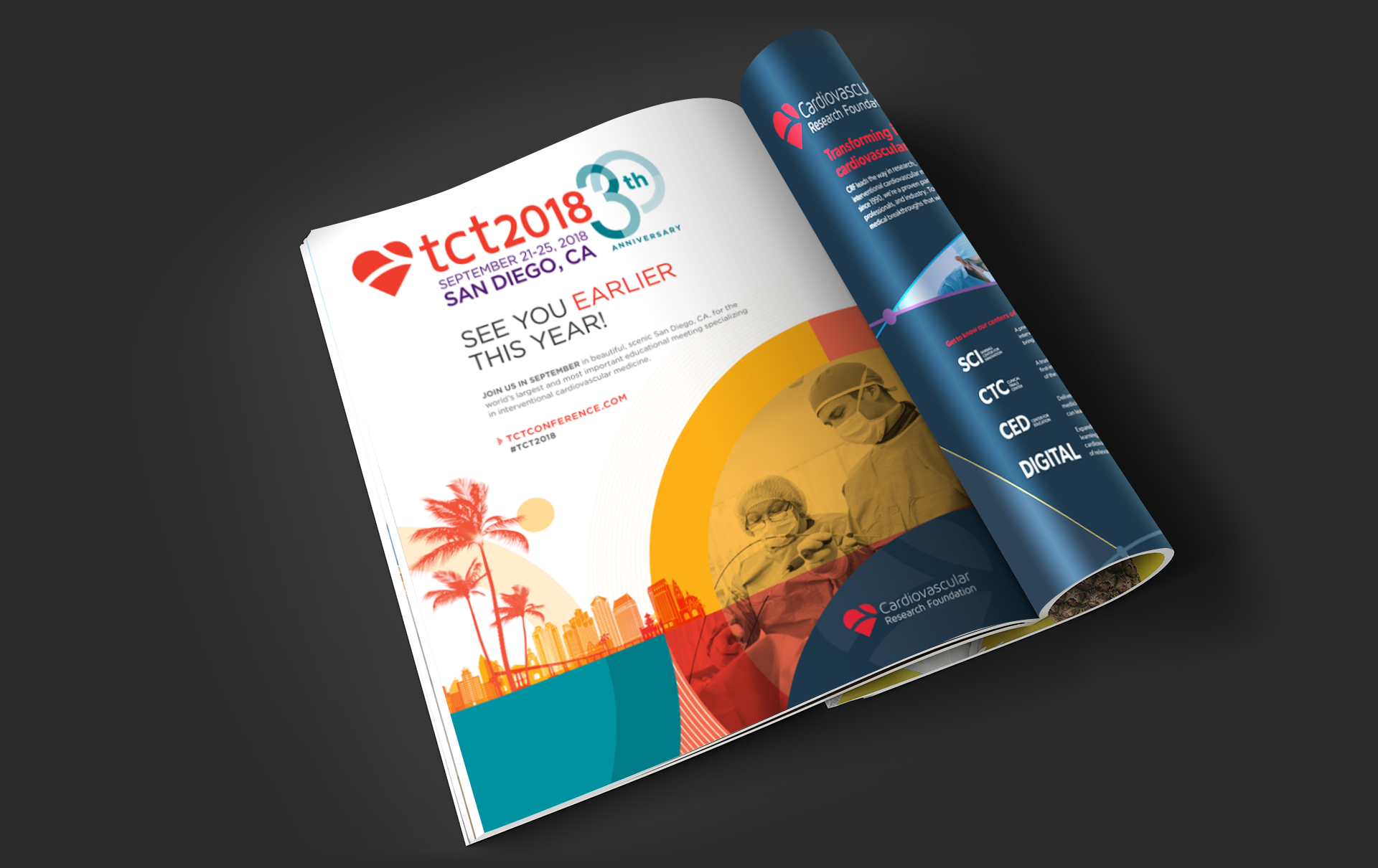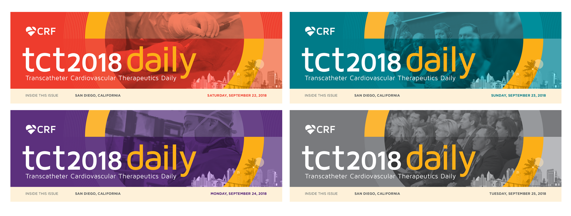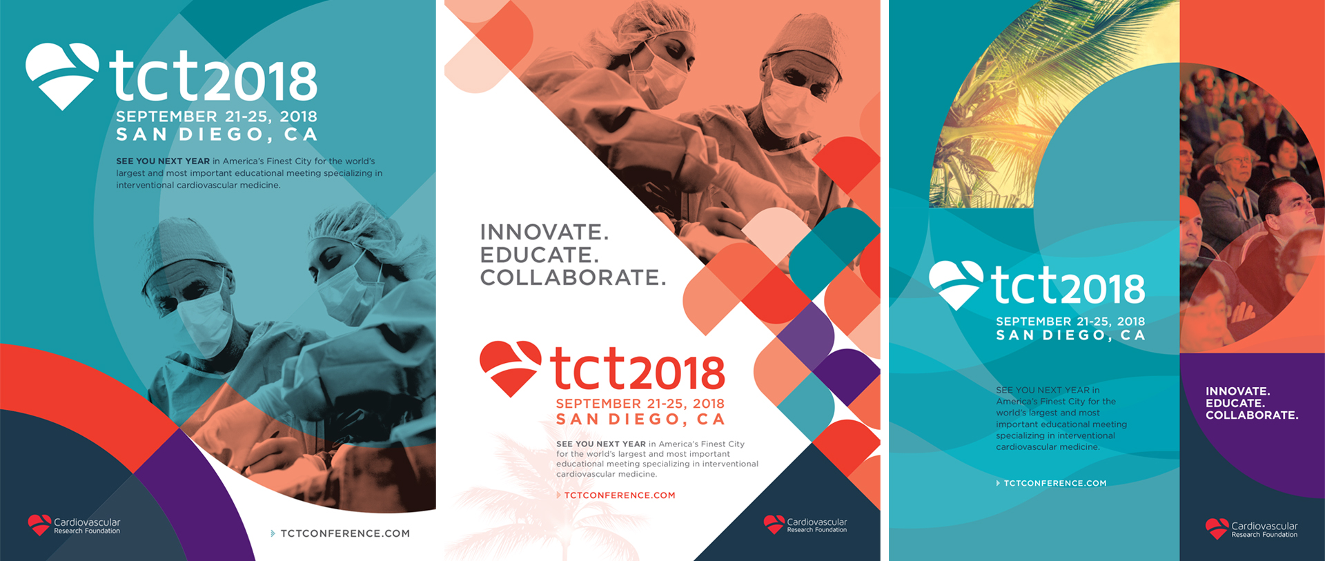 TCT (Transcatheter Cardiovascular Therapeutics) is the industry’s leading interventional cardiology conference, with approximately 10K global attendees. With the conference being held in San Diego, the stakeholders wanted a vibrant branding. By using a combination of vector illustrations, photography, clean typography, and elements that would tie it back to the convention center (circles), the branding was able to visually and creatively communicated messages in a unified way.