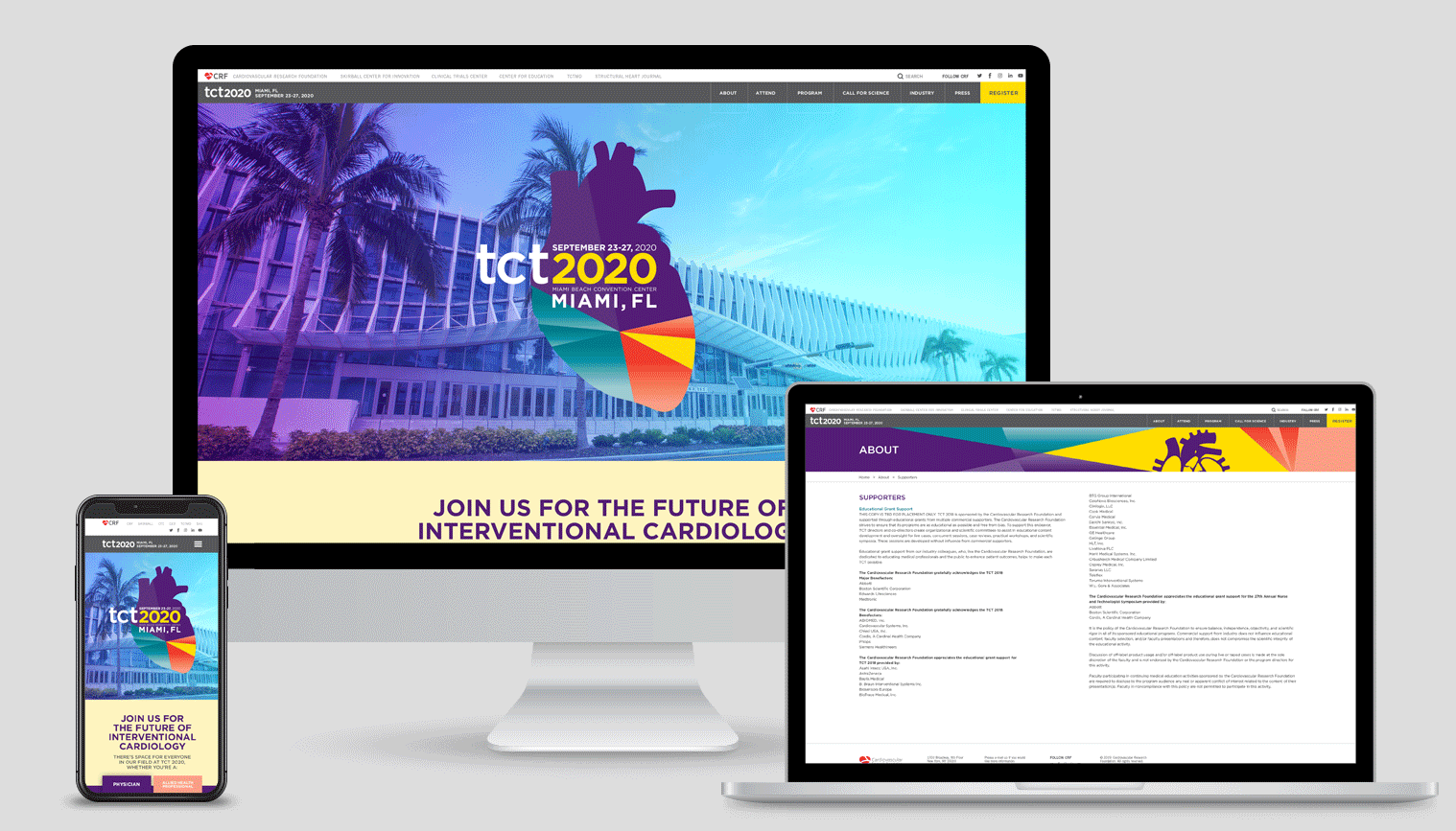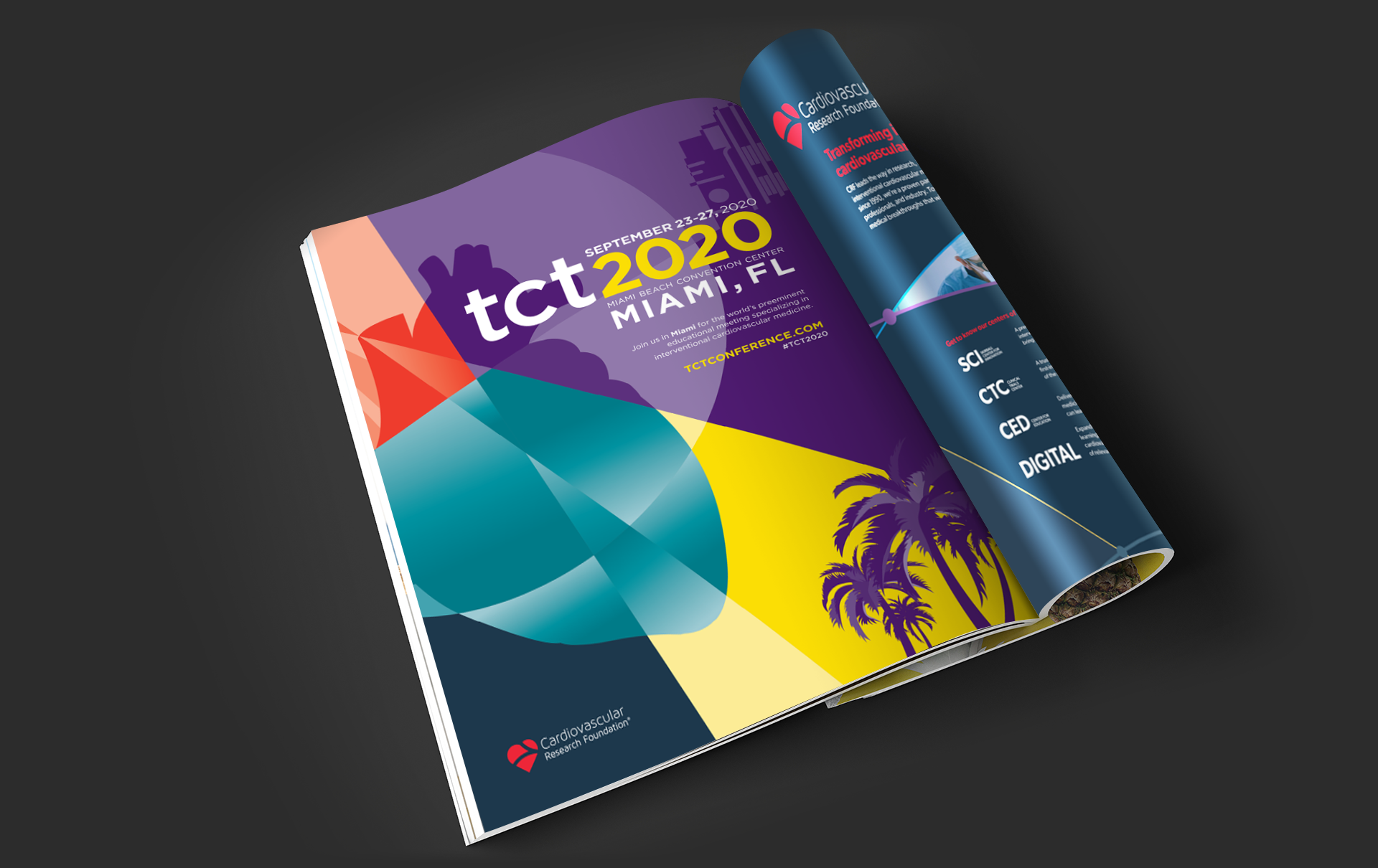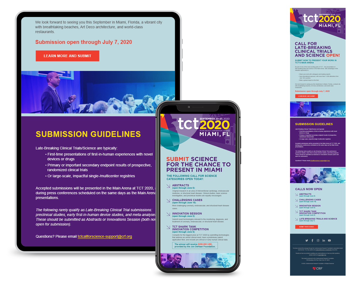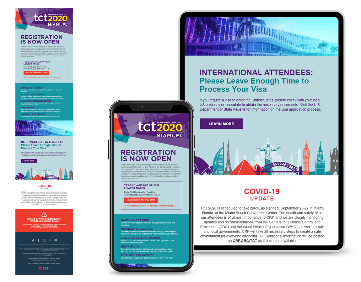 TCT (Transcatheter Cardiovascular Therapeutics) is the industry’s leading interventional cardiology conference, with approximately 10K global attendees. Having the conference in Miami, the stakeholders wanted a Miami look with vibrant colors but still using the conference branding color palette. With this being the year that the pandemic happened, the conference had to be rebranded mid-year as a virtual conference only. The stakeholders also wanted a different name that would connect our audience worldwide. The conference brand become more digital, with a dark look and feel.