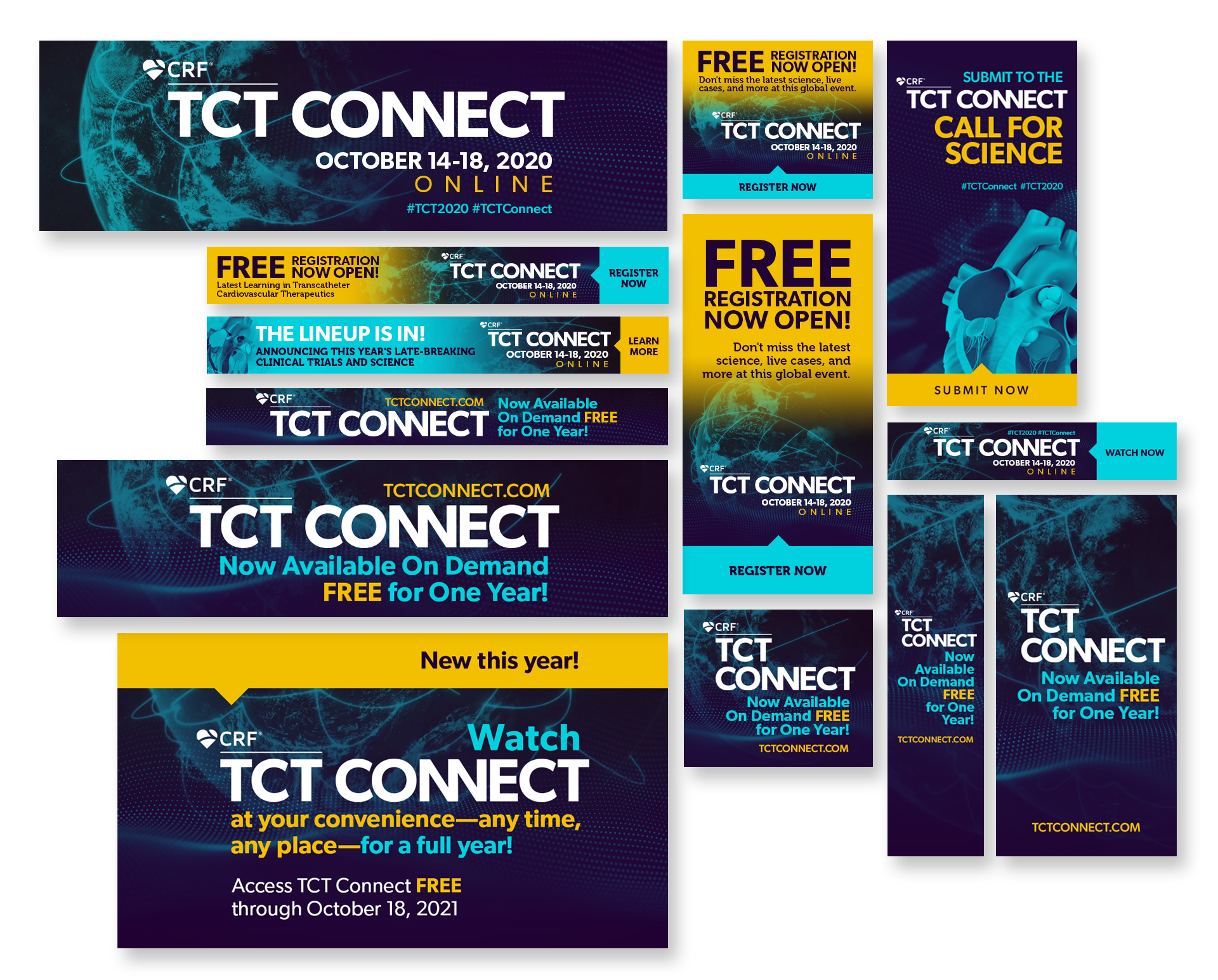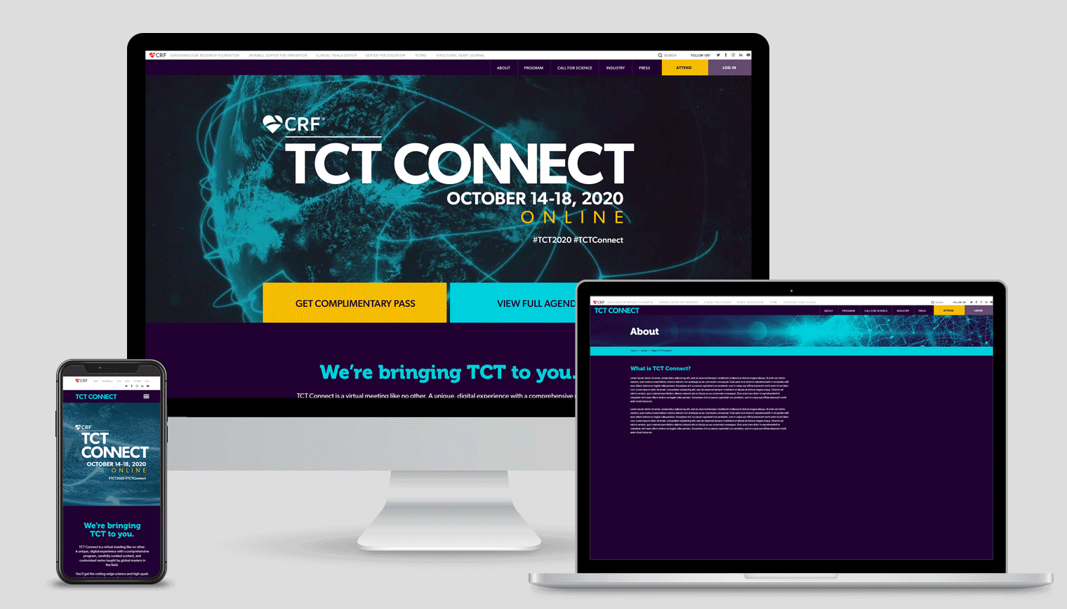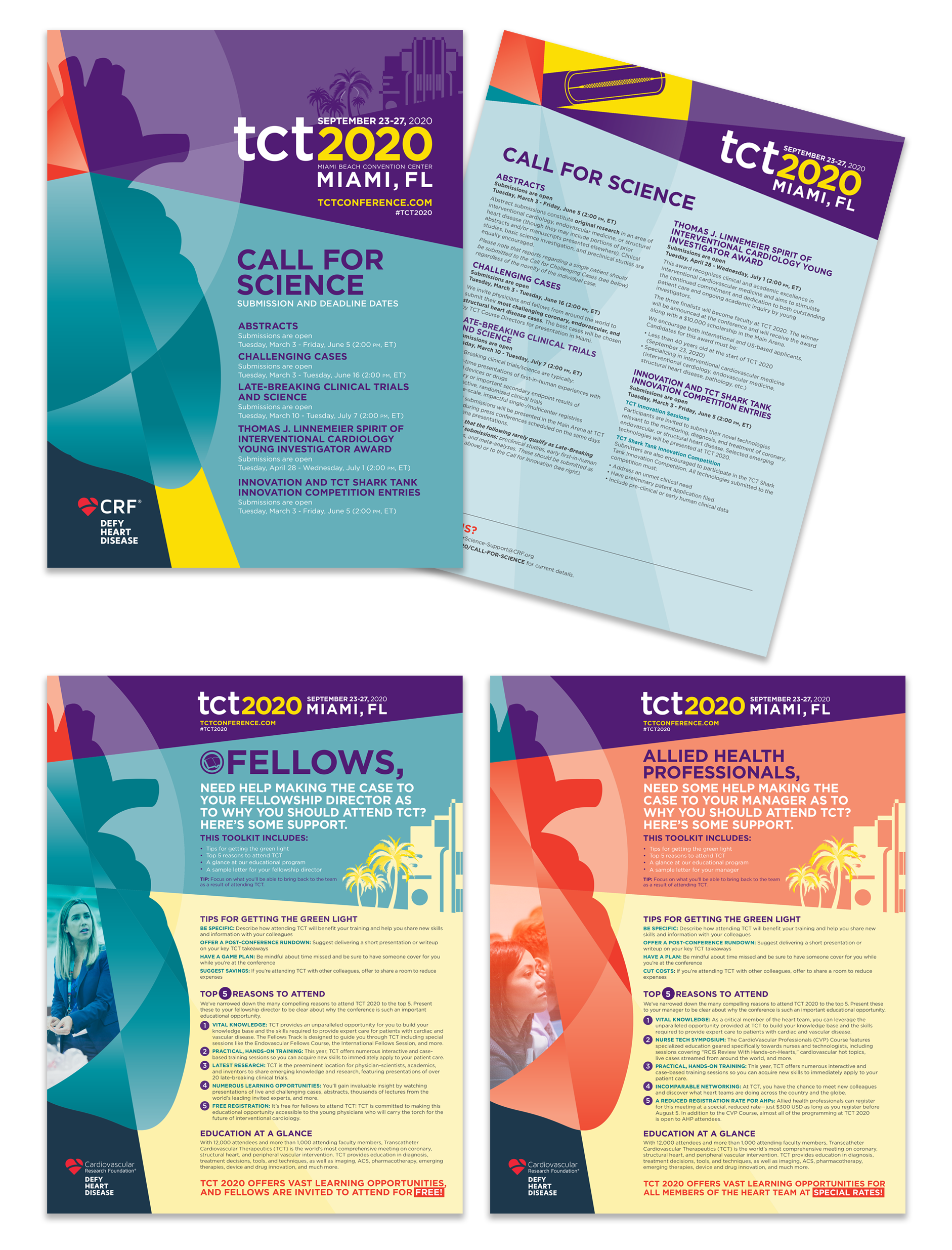 TCT (Transcatheter Cardiovascular Therapeutics) is the industry’s leading interventional cardiology conference, with approximately 10K global attendees. Having the conference in Miami, the stakeholders wanted a Miami look with vibrant colors but still using the conference branding color palette. With this being the year that the pandemic happened, the conference had to be rebranded mid-year as a virtual conference only. The stakeholders also wanted a different name that would connect our audience worldwide. The conference brand become more digital, with a dark look and feel.