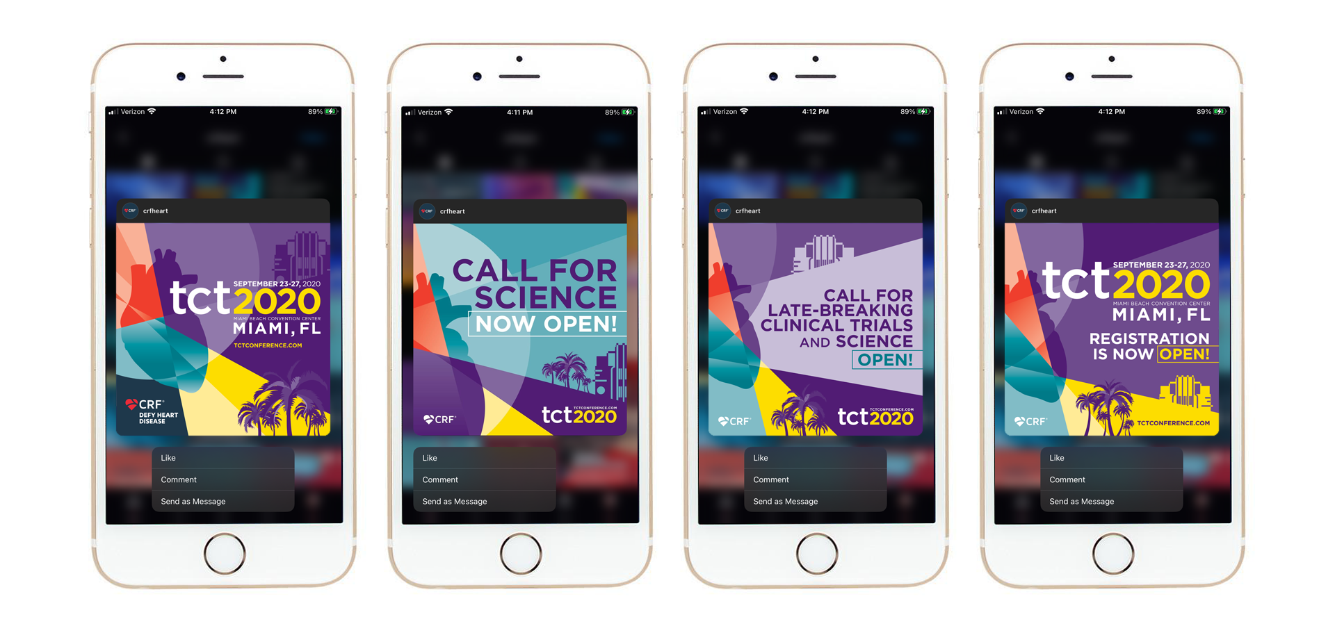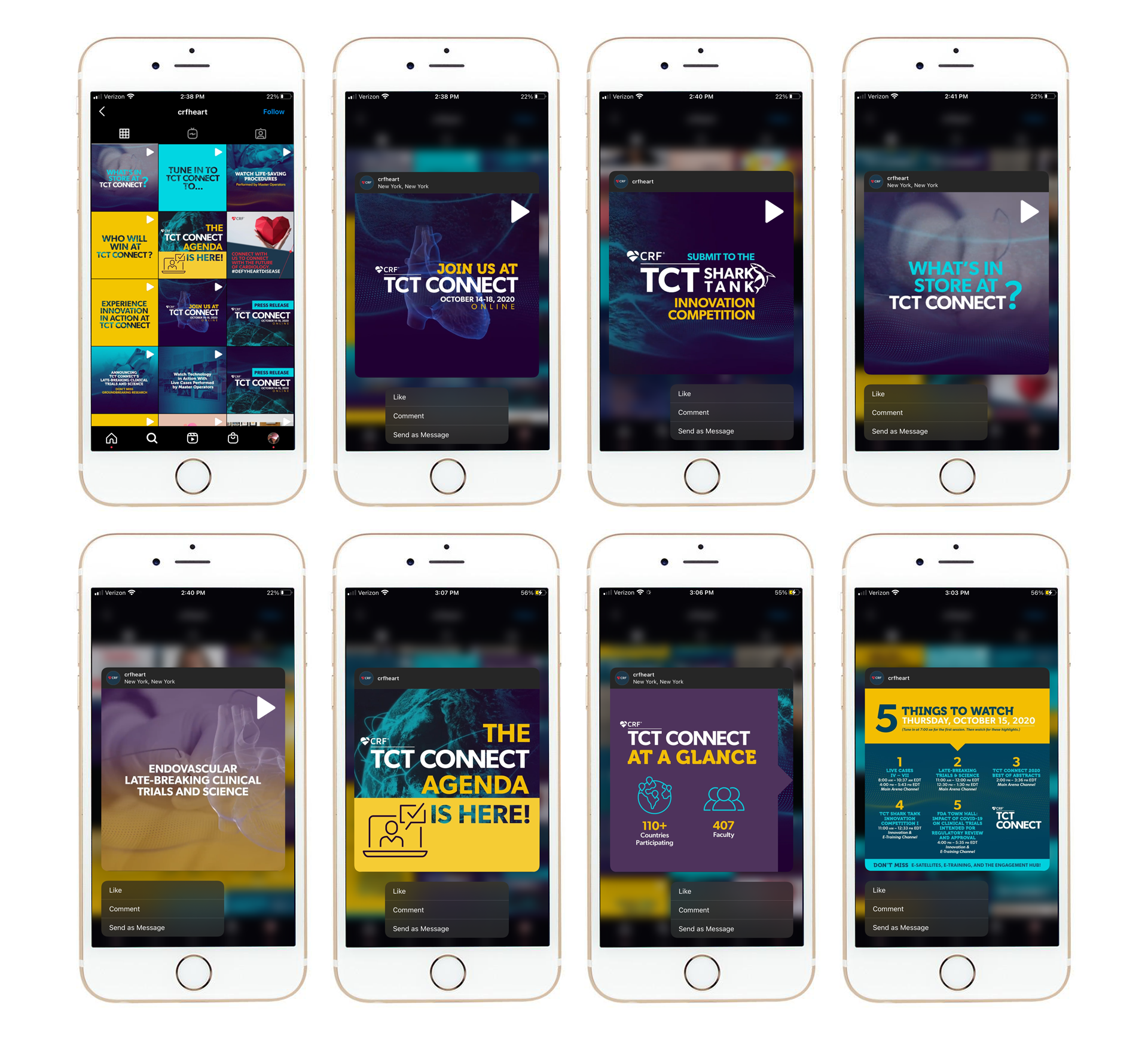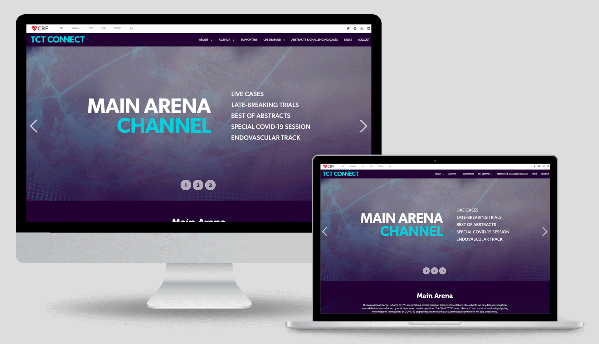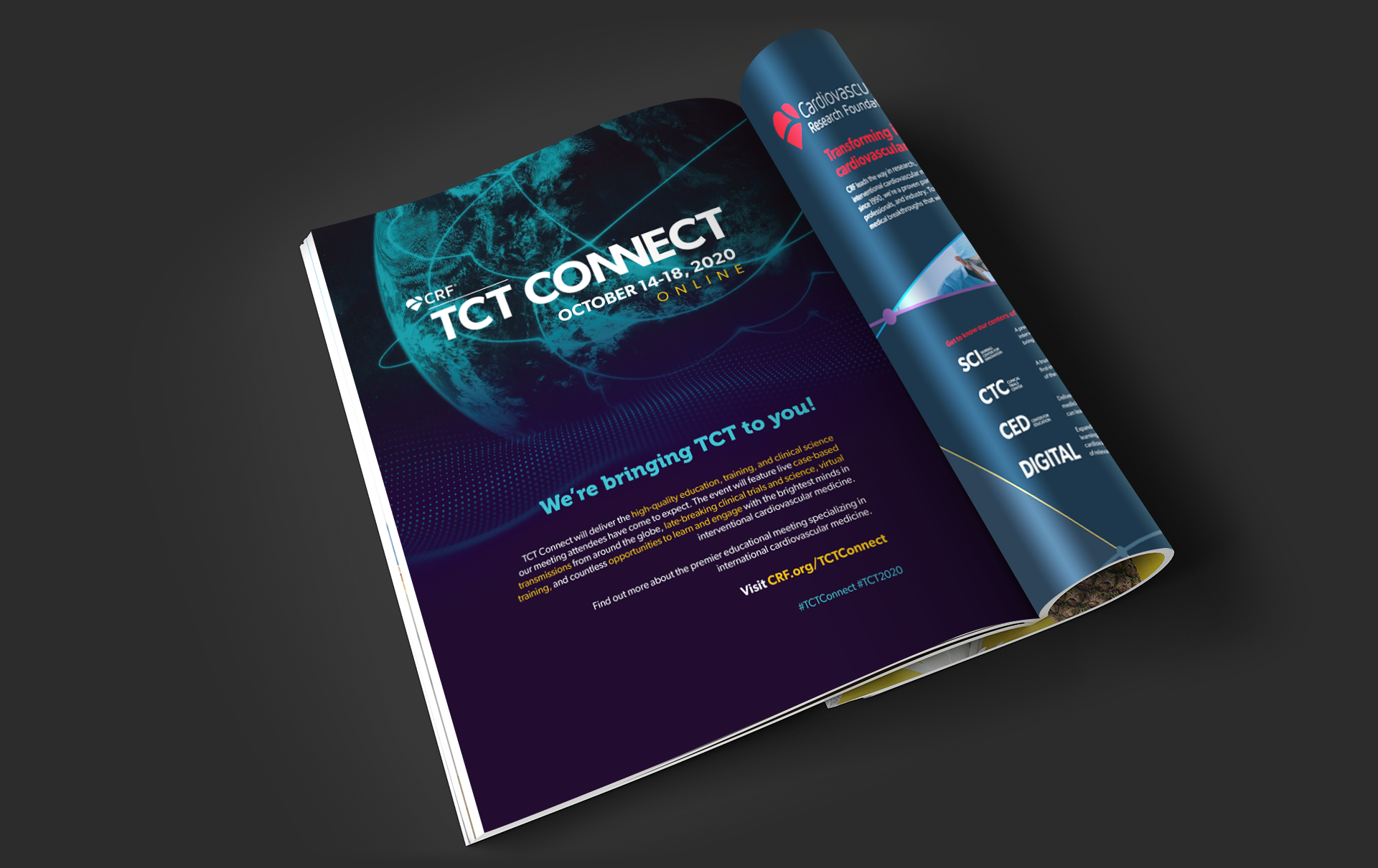 TCT (Transcatheter Cardiovascular Therapeutics) is the industry’s leading interventional cardiology conference, with approximately 10K global attendees. Having the conference in Miami, the stakeholders wanted a Miami look with vibrant colors but still using the conference branding color palette. With this being the year that the pandemic happened, the conference had to be rebranded mid-year as a virtual conference only. The stakeholders also wanted a different name that would connect our audience worldwide. The conference brand become more digital, with a dark look and feel.