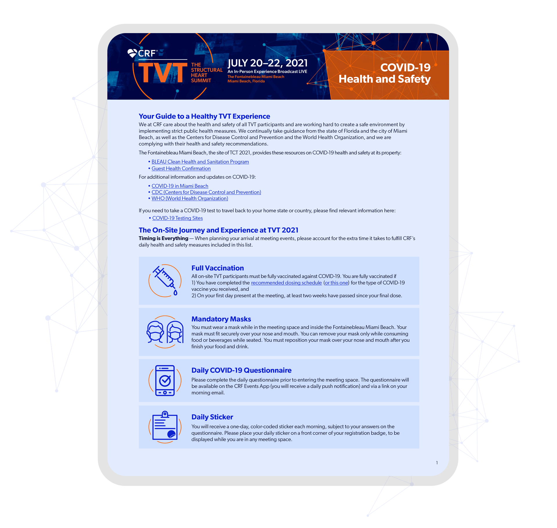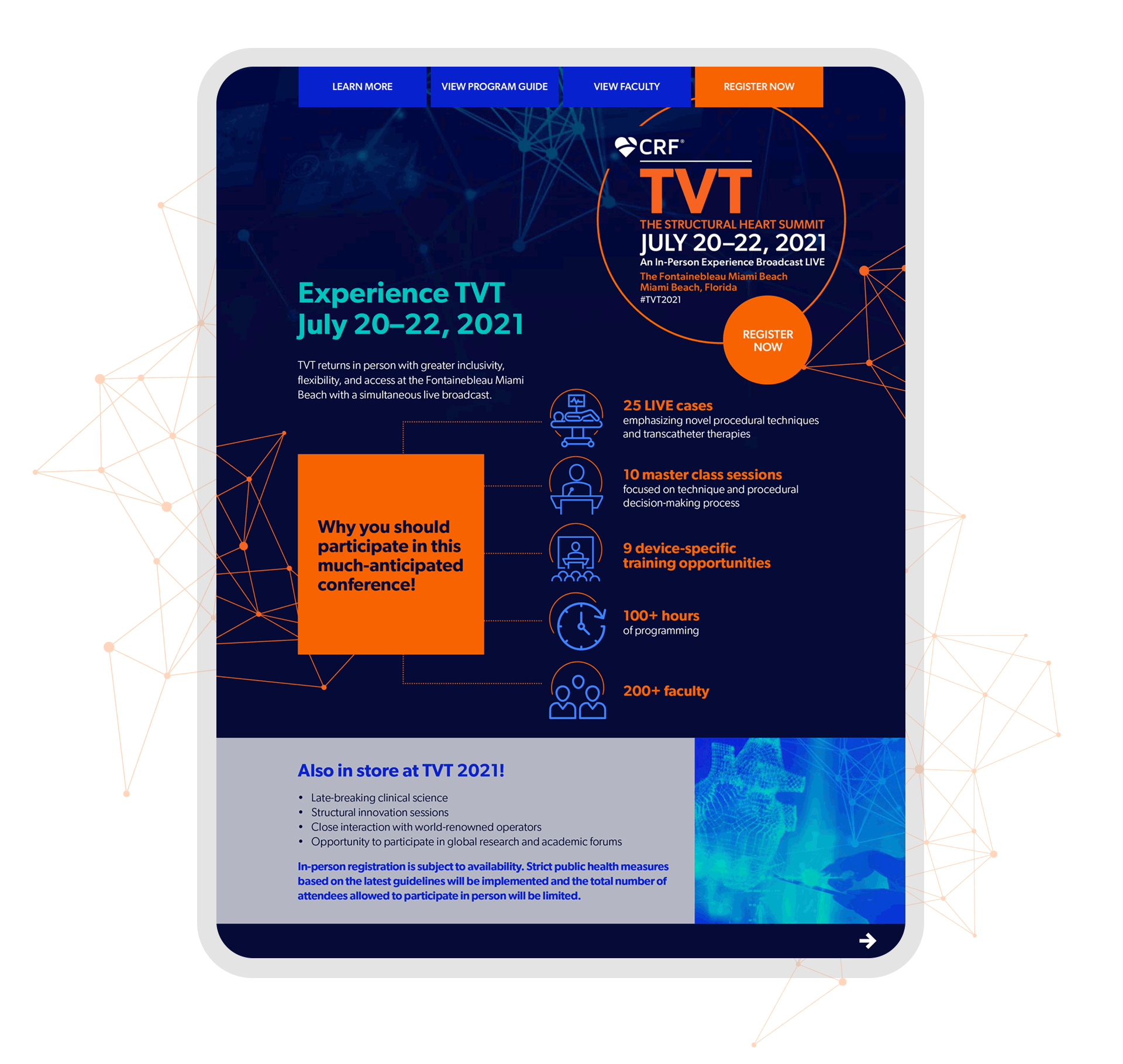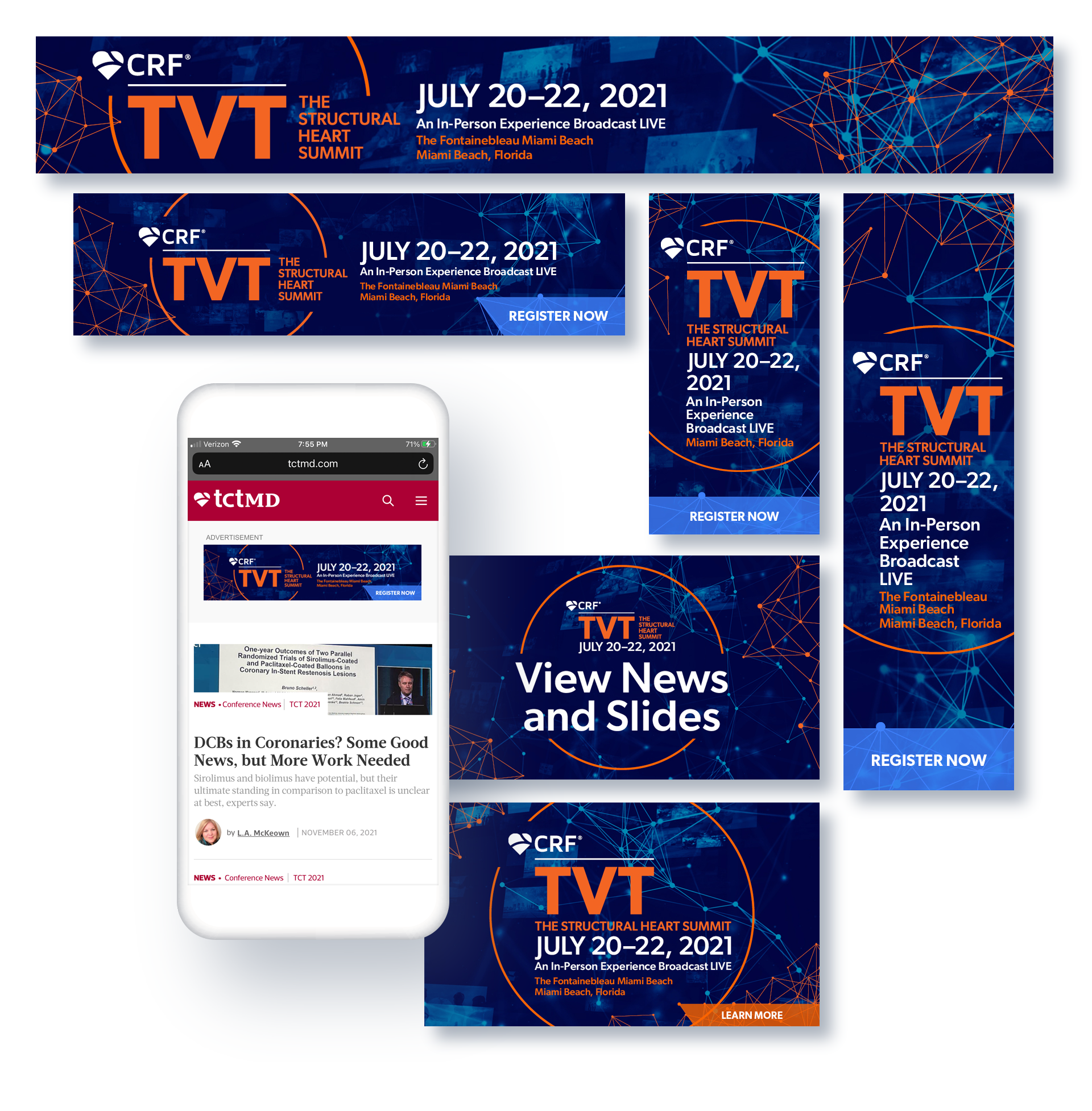 The Transcatheter Valve Therapy (TVT) meeting explores vital topics in valvular and structural heart disease through a rich didactic program, streaming live cases, and in-depth case-based workshops. This being the second year with a virtual component due to Covid-19, the stakeholders requested to keep similar branding from previous year to attract more online attendees.