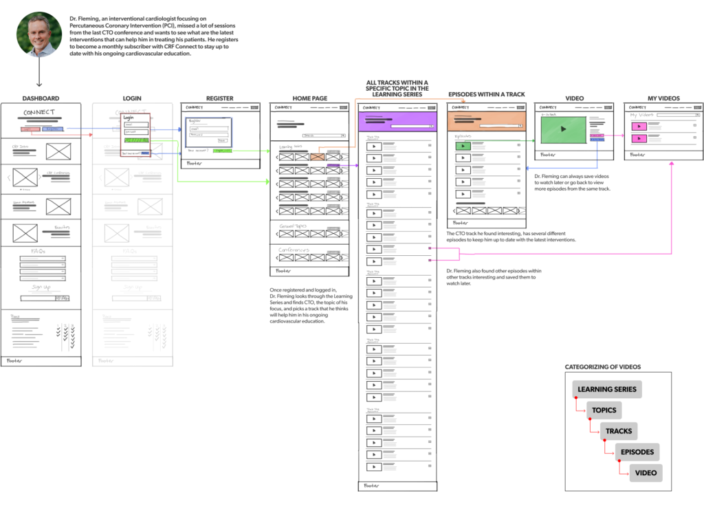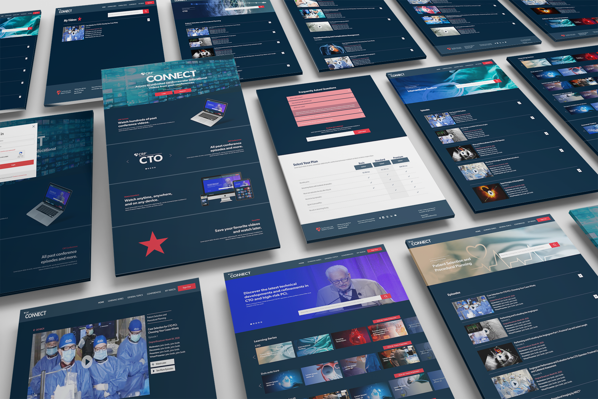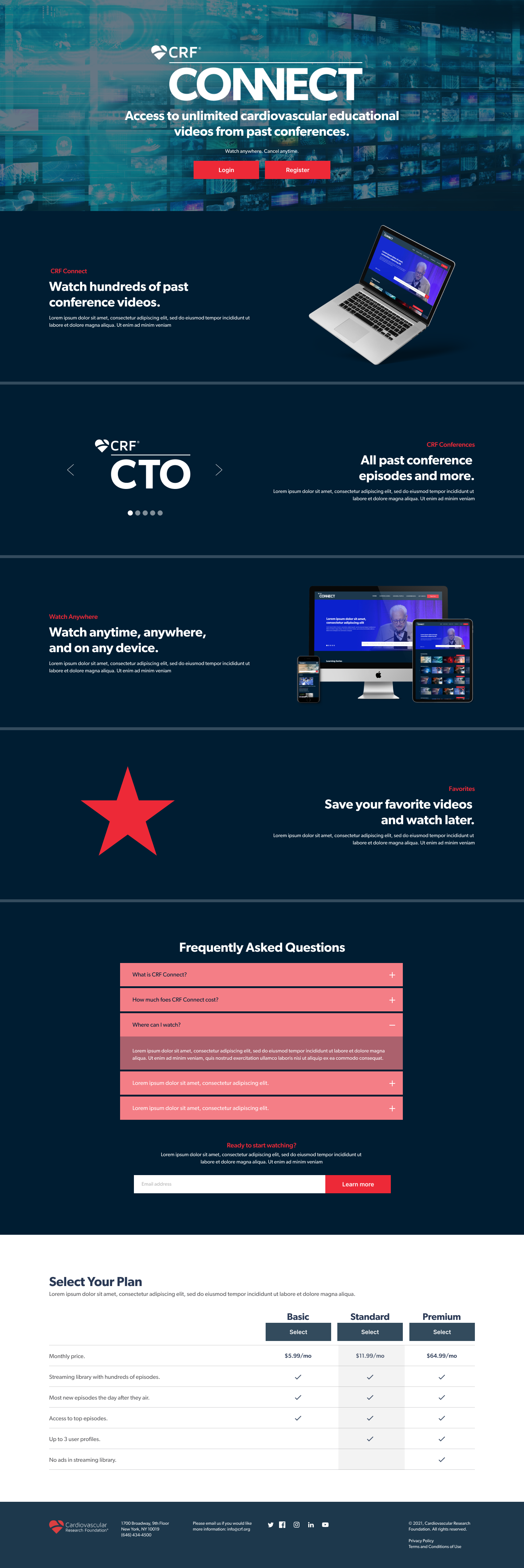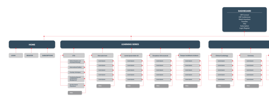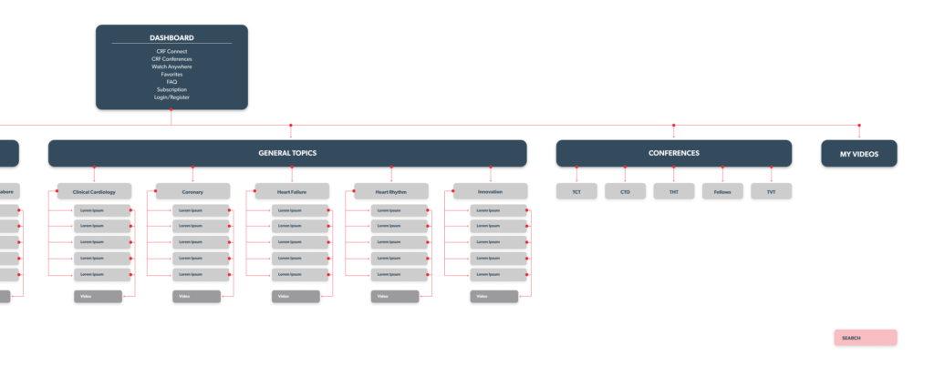In order to combine all the different topics from all the past conferences, we focused on categorizing all the videos by using metadata and tags. By doing so, this allowed us to combine similar learning sessions from different conferences under the same topics which made it easy for the user when doing a search for a specific category. We also created subscription plans to suit practitioners needs, this would allow to generate revenue for CRF post conferences. We also used dark colors which are part of the CRF brand guideline to give it a streaming service feel.