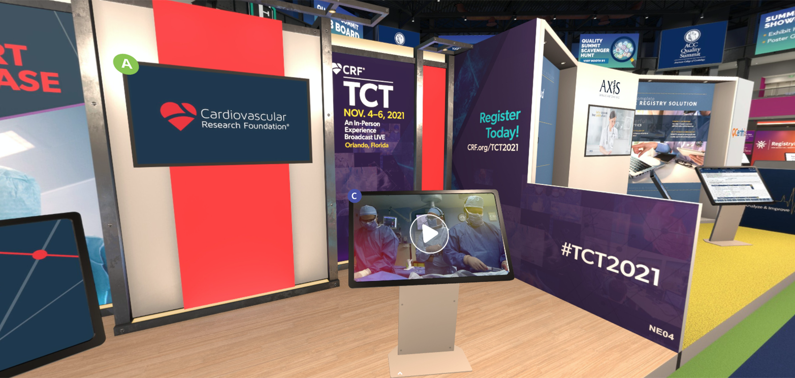 Due to the pandemic, the Cardiovascular Research Foundation decided to do a virtual booth at ACC (American College of Cardiology) to promote our biggest conference, TCT (Transcatheter Cardiovascular Therapeutics) 2021. You were able to walk through the entire exhibit hall virtually and interact with the graphics and videos.